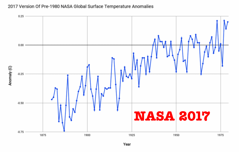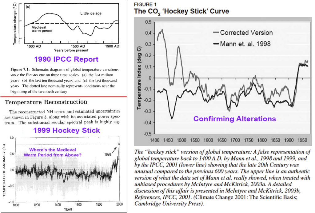Above, the IPCC changed temperatures to the lower left, with the alterations confirming the changes on its right, and below are NASA’s “time of observation” alterations.